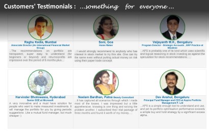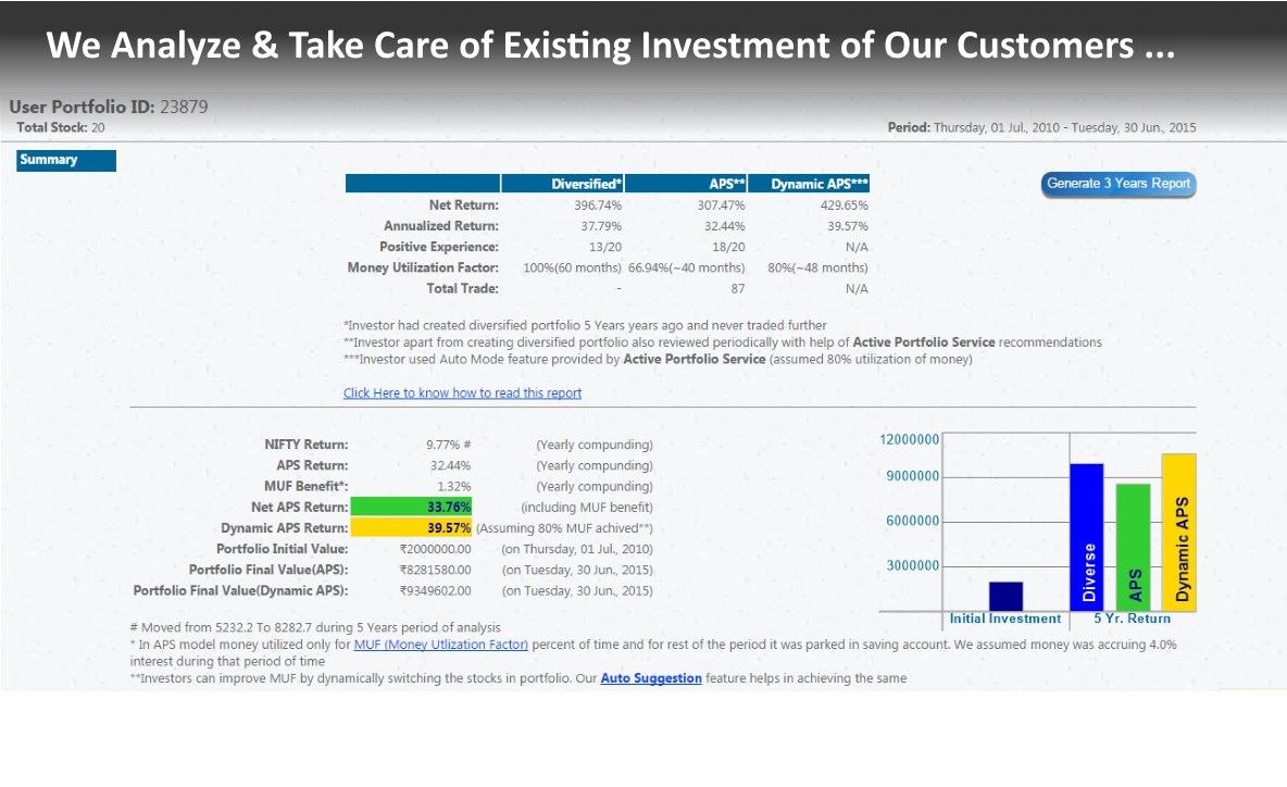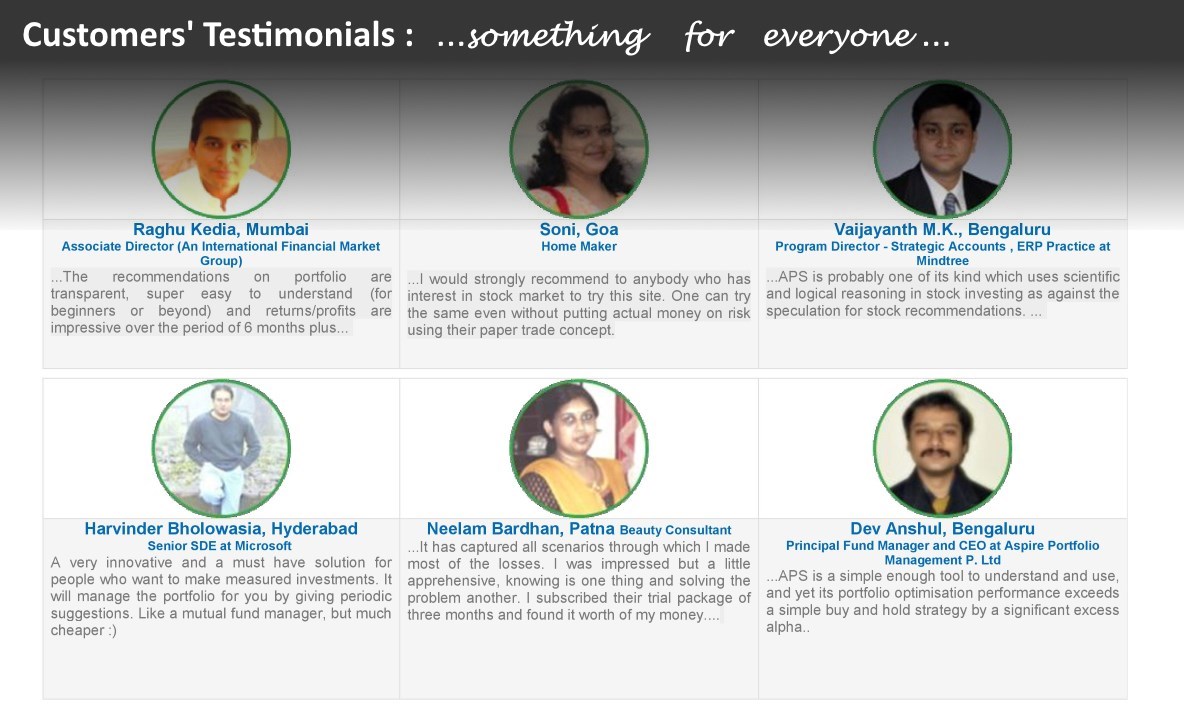 This web site manages individual investors equity portfolios and provides customized recommendations to client as unique as the client is. The website also has some static tools to prove the concept behind. Any visitor can create a portfolio with certain guidelines (total possiblity exceeds billions) and system analyzes and returns performance analysis in real time. All this happens in just few seconds.